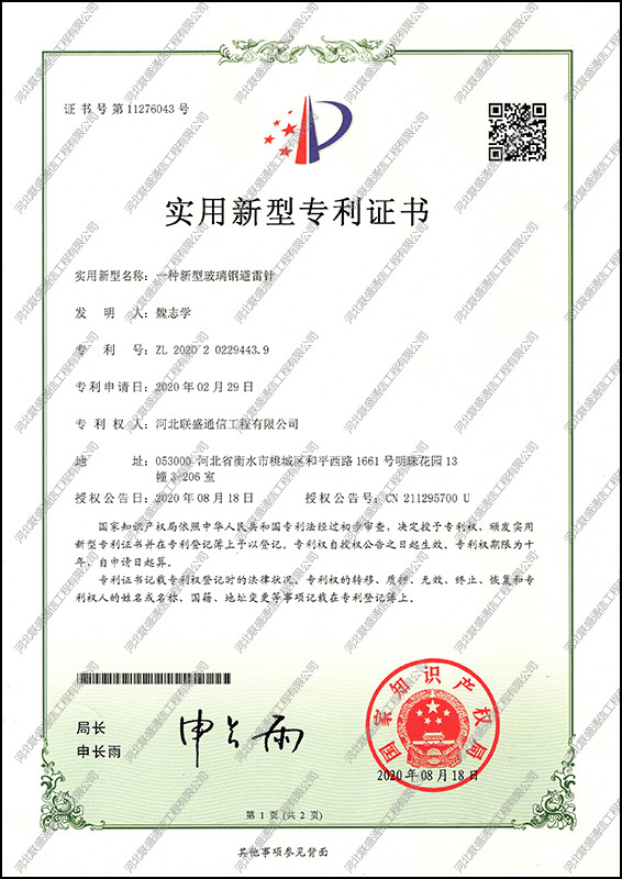 玻璃鋼避雷針實用新型專利證書